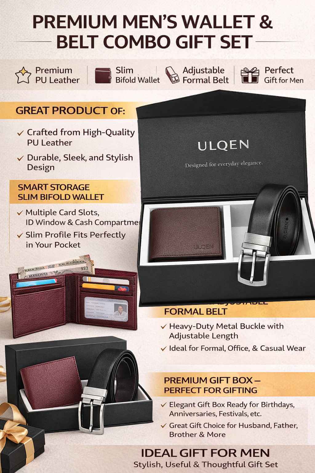 Upgrade your everyday essentials with the ULQEN Men’s Wallet & Belt Combo Gift Set, designed for men who appreciate style, practicality, and quality.